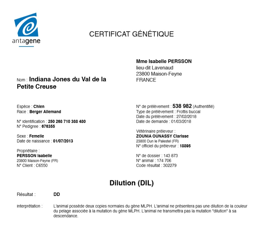 Dilution (DIL) : homozygote DD (aucun risque de dilution - robe bleue - et de transmission de l'alopécie des robes diluées à sa descendance)