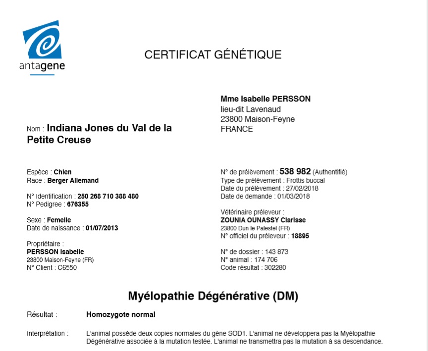 Myélopathie dégénérative (MD) : homozygote normal (aucun risque de transmission à sa descendance)