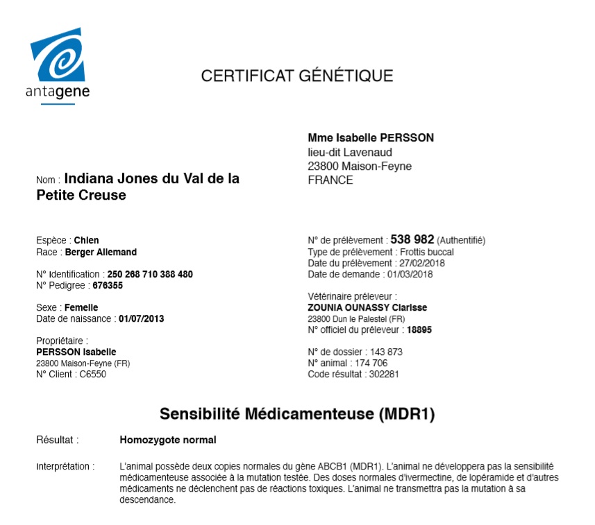 Sensibilité médicamenteuse (MDR1) : homozygote normal (aucun risque de transmission à sa descendance)