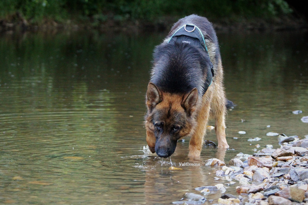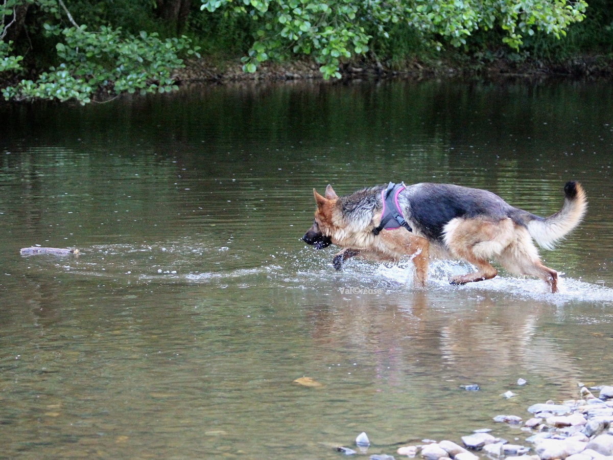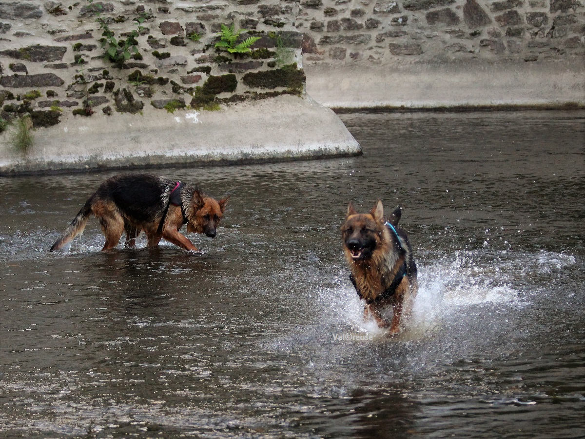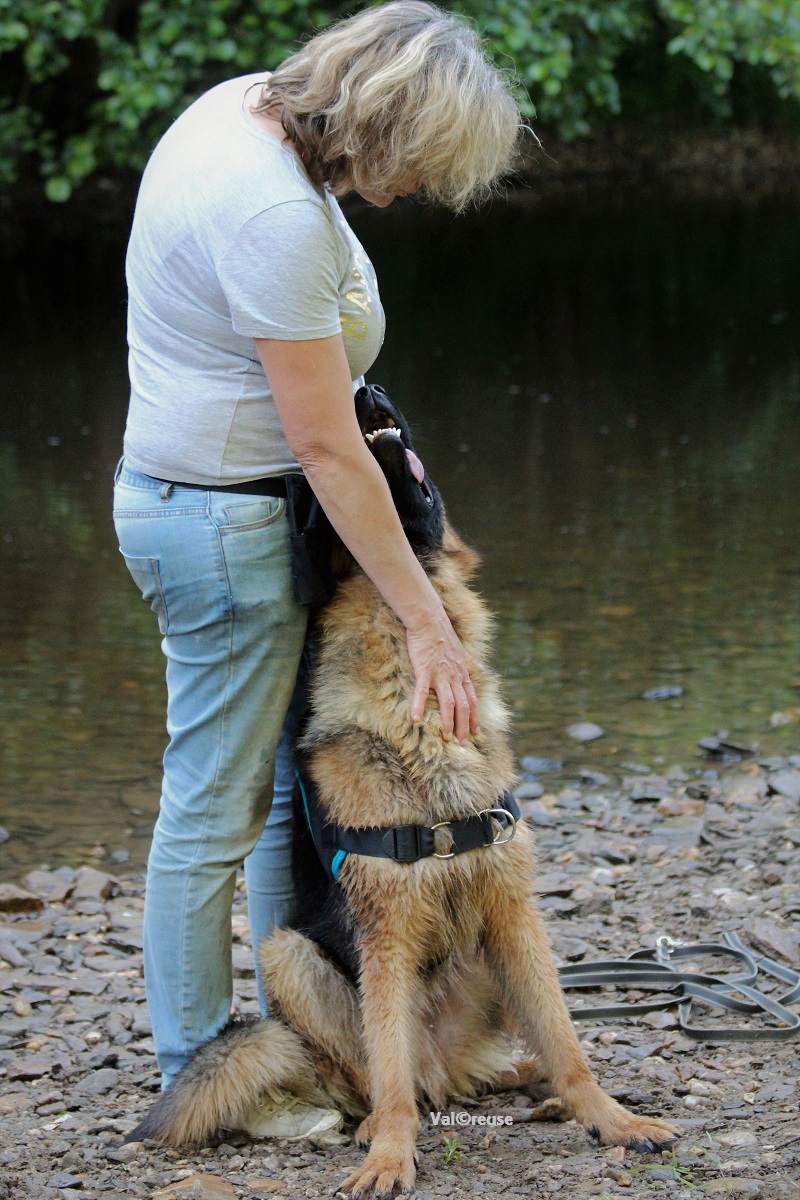 On progresse à vitesse lente mais on progresse. La réelle confiance que Matcho semble nous témoigner nous permet d’envisager désormais d’aller balader dans des lieux lui étant inconnus au risque d’y rencontrer des promeneurs. Matcho découvre l’eau et y prend beaucoup de plaisir ; c’est l’occasion pour nous d’évaluer un peu sa gestion des frustrations, un point qu’il va falloir travailler.