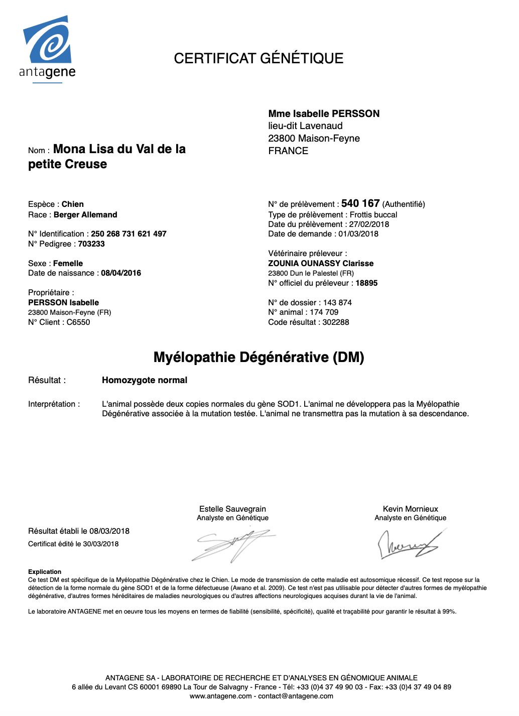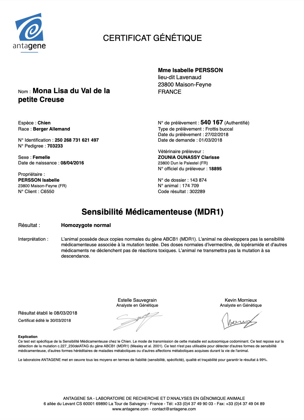 Sensibilité médicamenteuse (MDR1) : homozygote normal (aucun risque d’expression de la sensibilité médicamenteuse ni chez le chien ni chez sa descendance)