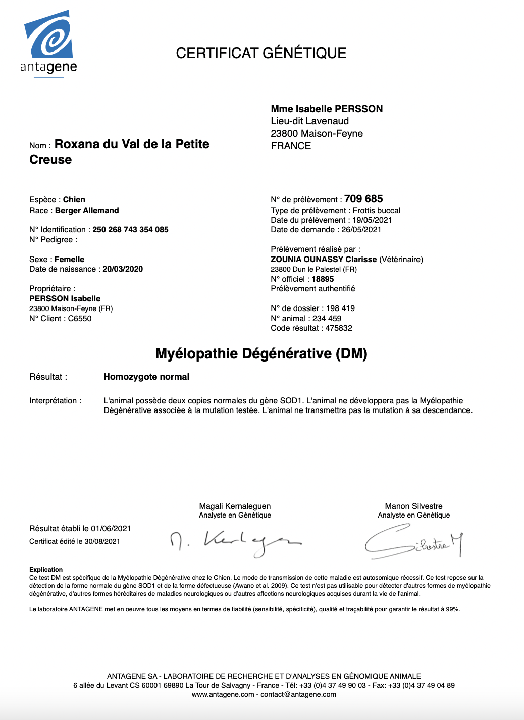 Myélopathie dégénérative (DM) : 1-1  équivalent à homozygote normal. Aucun risque d’expression de cette maladie chez lui même ou ses descendants.
