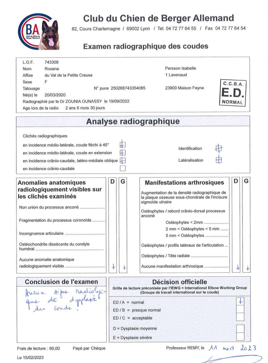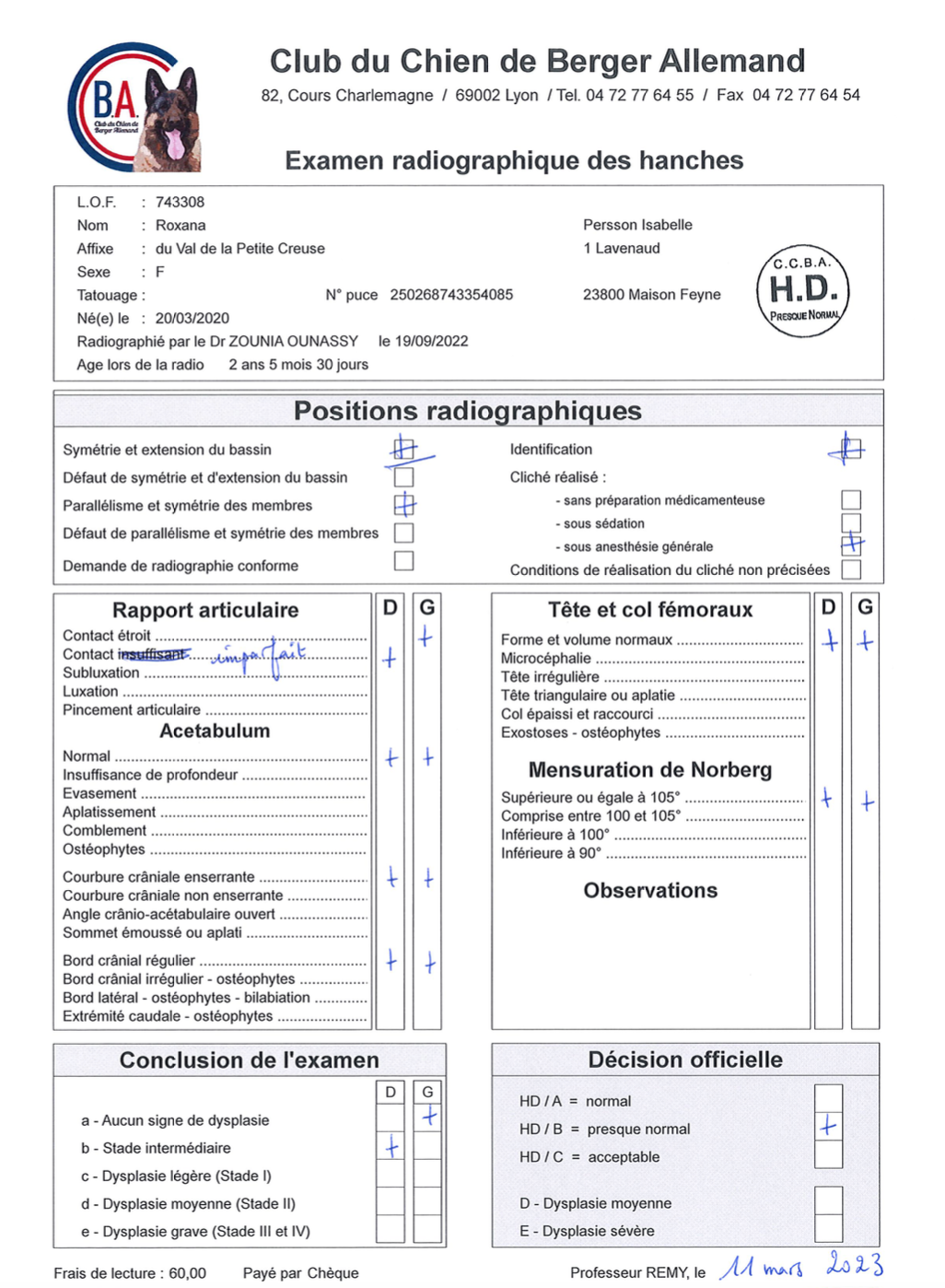 Sur elle repose la continuité de notre sélection puisqu’elle rassemble tous nos critères fondamentaux : exempte de dysplasie, de myélopathie, de sensibilité médicamenteuse, morphologie parfaite dans le standard sans aucun excès nul part, magnifique couleur avec un beau masque noir que nous affectionnons tant et une magnifique tête. Disons le Roxana est la consécration de 25 ans de travail.