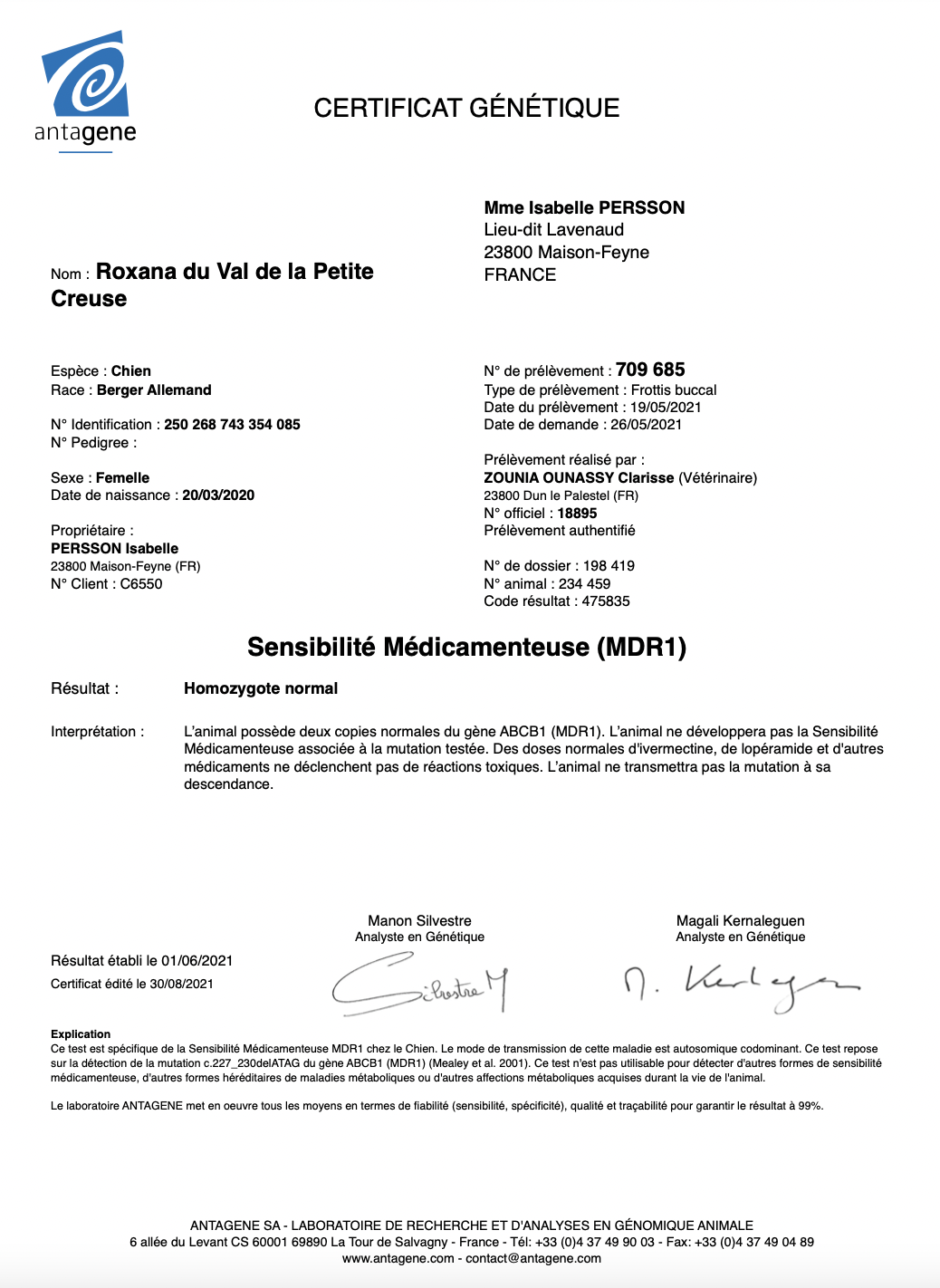 Sensibilité médicamenteuse (MDR1) : homozygote normal (aucun risque d’expression de la sensibilité médicamenteuse ni chez le chien ni chez sa descendance)