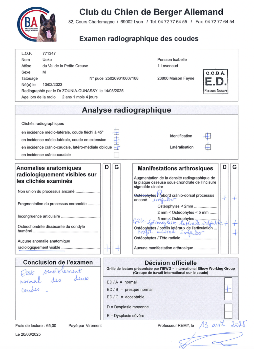 Résultats de la lecture des radios des hanches et des coudes : HD/A  et ED/sl