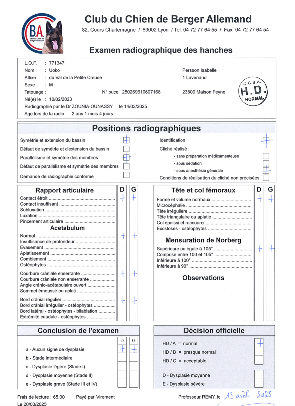Dilution (DIL): homozygote DD par filiation (aucun risque d’expression de la dilution – robe bleue – et d’expression de l’alopécie des robes diluées chez sa descendance)