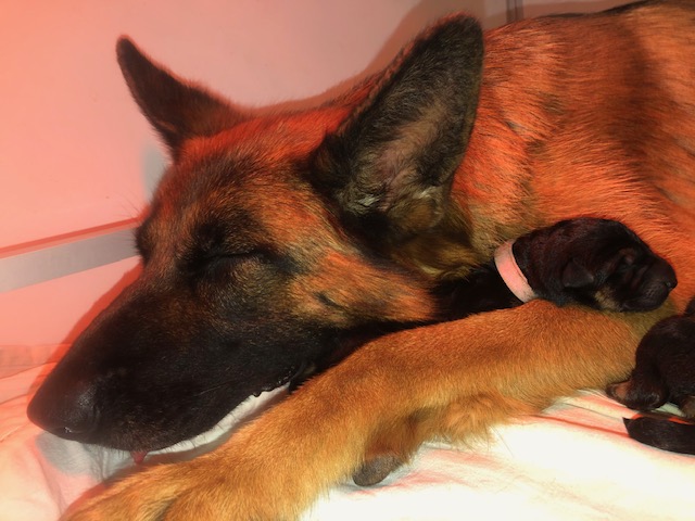 La mise-bas s’est bien déroulée, mais a été assez longue dans l’ensemble. Montana, comme pour sa première portée est une très bonne maman.
