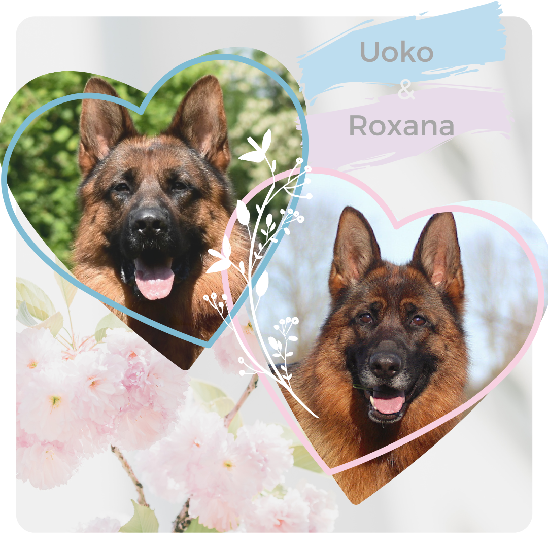 Uoko et Roxana ne présentant pas de « défauts » nécessitant de prendre des précautions particulières lors de l’accouplement, ils se complètent naturellement. Tous deux sont dans la taille standard. Nous nous attendons à de futurs chiens assez puissant tout de même (les ascendants de chacun le sont). Compte tenu de la couleur de Roxana et Uoko nous nous attendons à des bébés très colorés.