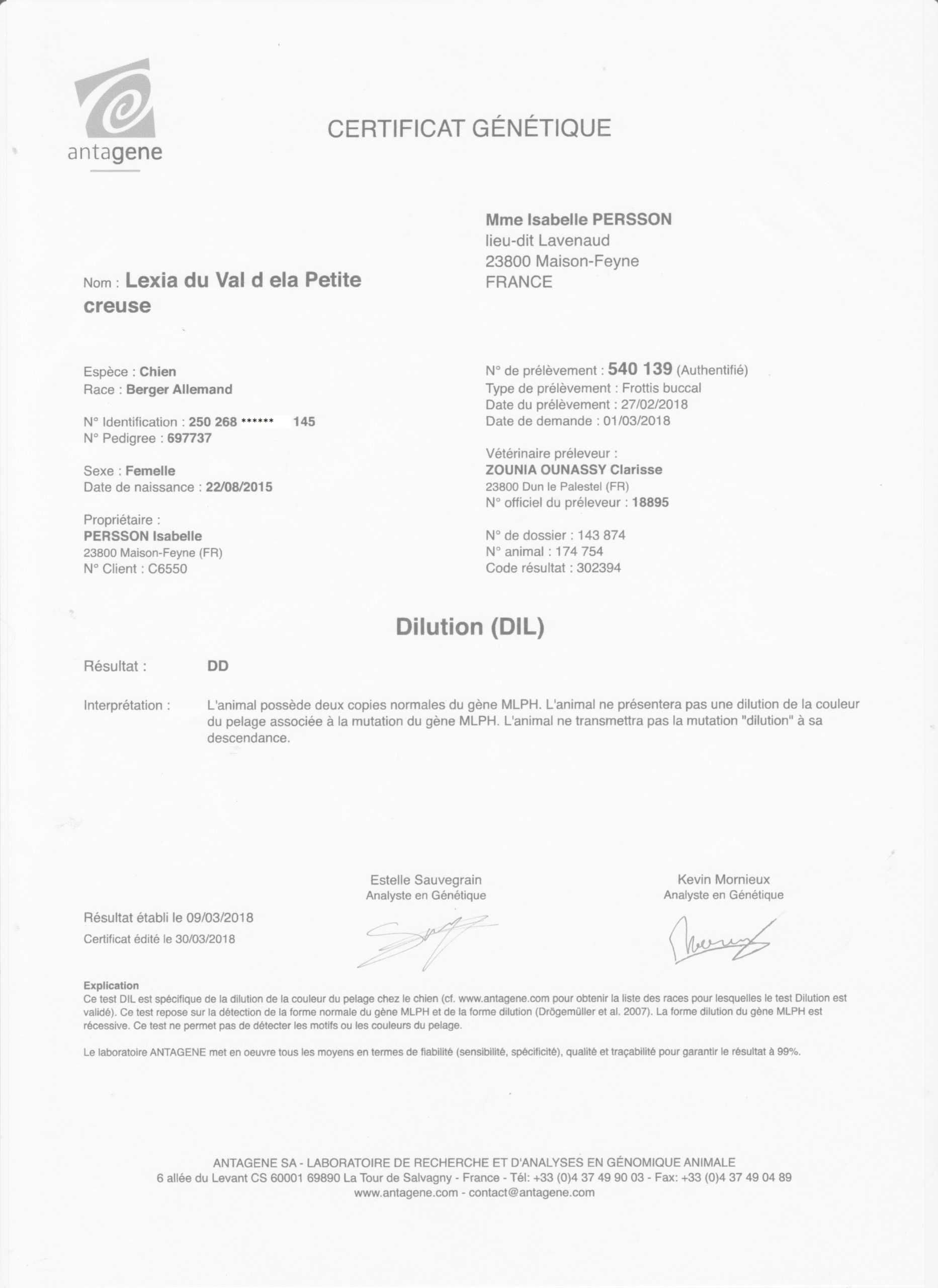 Dilution (DIL): homozygote DD (aucun risque de dilution - robe bleue - et de transmission de l'alopécie des robes diluées à sa descendance)