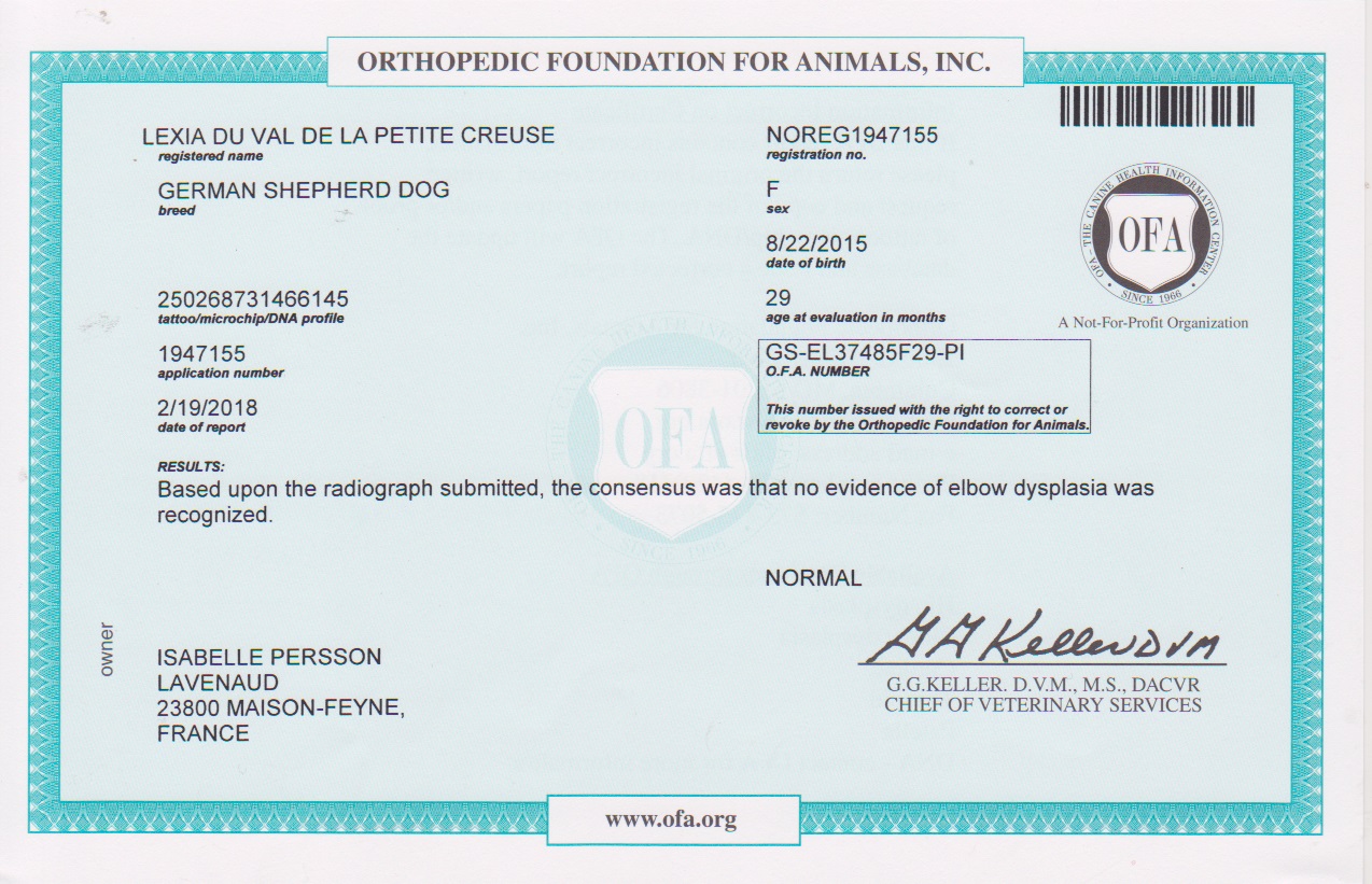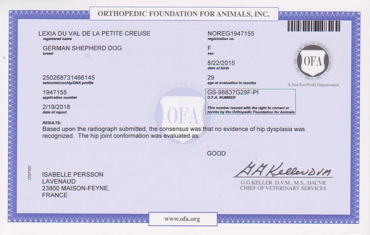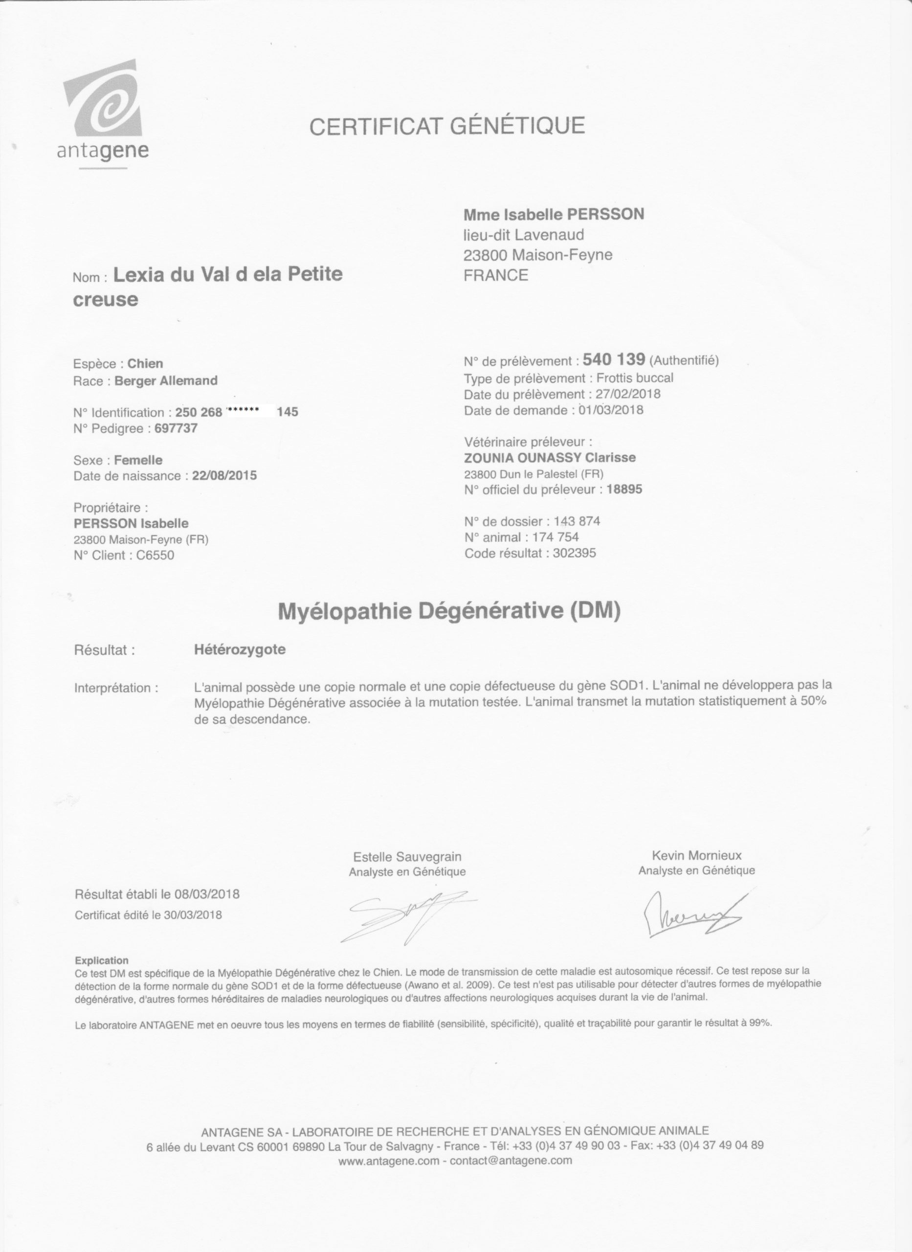 Myélopathie Dégénérative (MD): hétérozygote (porteur sain ne présentant aucun risque d'expression ni de transmission à sa descendance si accouplé avec un homozygote normal). Sa mère étant homozygote, cette hétérozygotie est à porter au crédit du père :-/