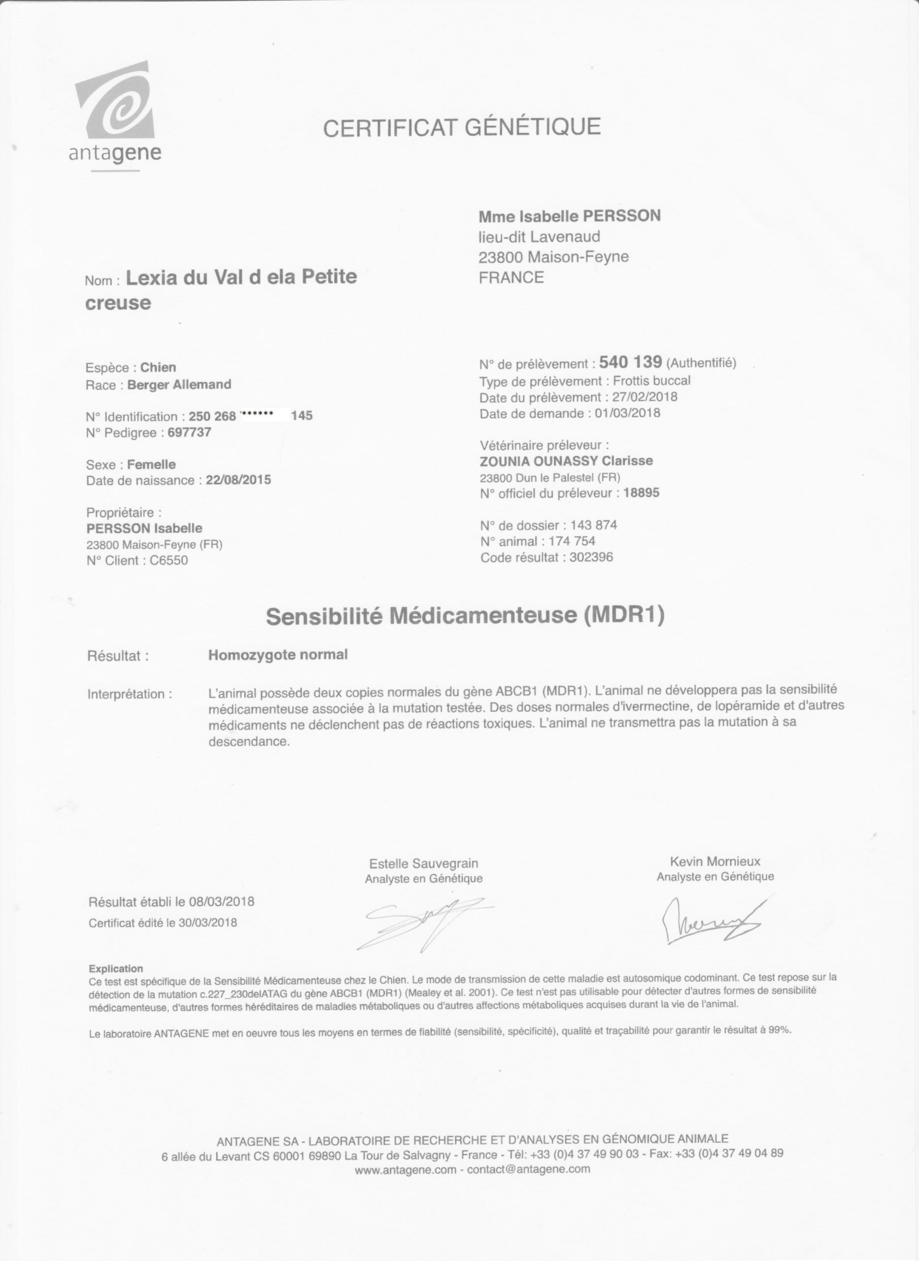 Sensibilité médicamenteuse (MDR1) : homozygote normal (aucun risque de transmission à sa descendance)