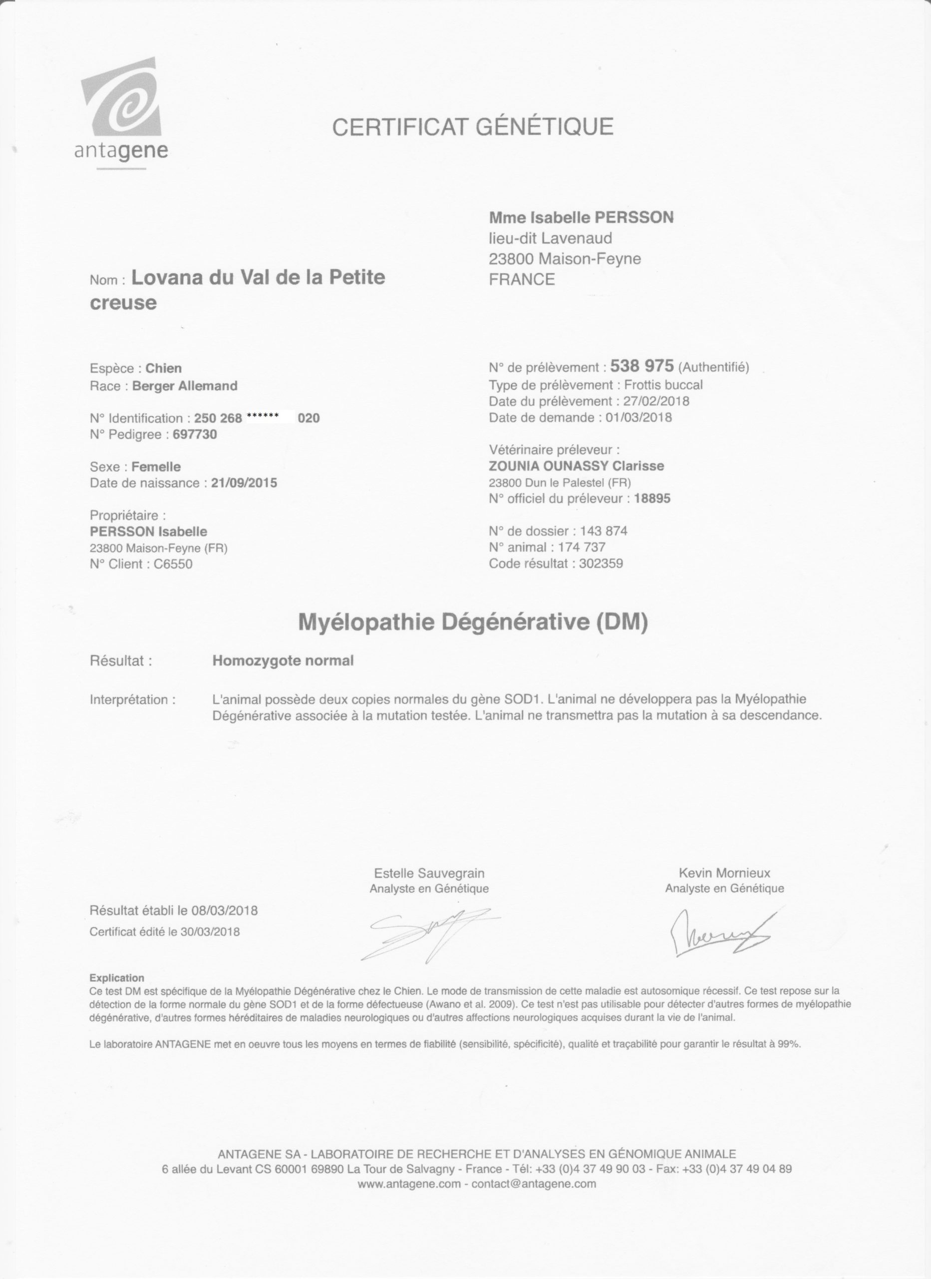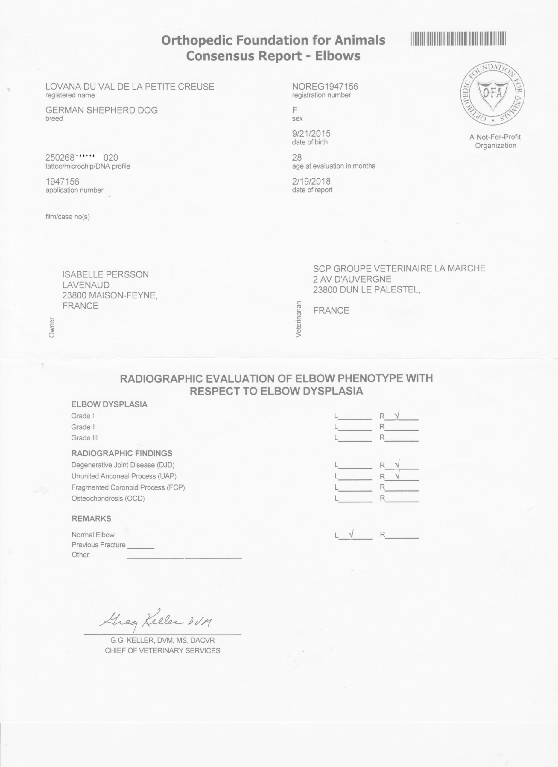 *ED/ Grade 1 : correspond à une dysplasie légère des coudes, en l’occurrence du coude droit pour Lovana. Le propre d’un sélectionneur est de prendre acte d’un élément et de le mettre en perspective au moment d’un accouplement. La dysplasie des coudes étant une affection polygénique et multifactorielle (ce qui signifie que la sélection traditionnelle par reproduction de parents sains est inopérante), elle a été mise en perspective des autres éléments tout aussi importants – si ce n’est davantage – que sont la dysplasie des hanches également polygénique et multifactorielle, la myélopathie dégénérative, la sensibilité médicamenteuse, la conformité au standard et les qualités morphologiques et caractérielles recherchées par l’élevage, d’autant plus que l’interprétation de la radio n’est pas corroboré par des symptômes.