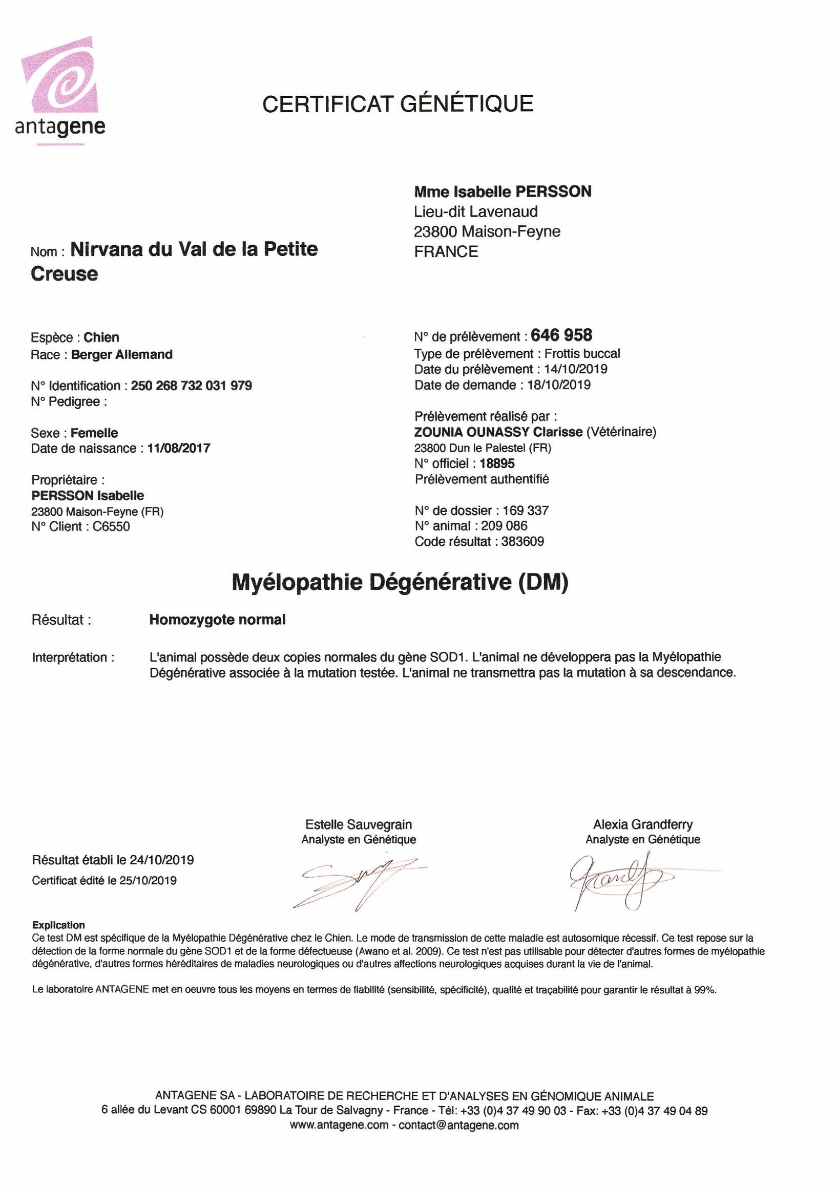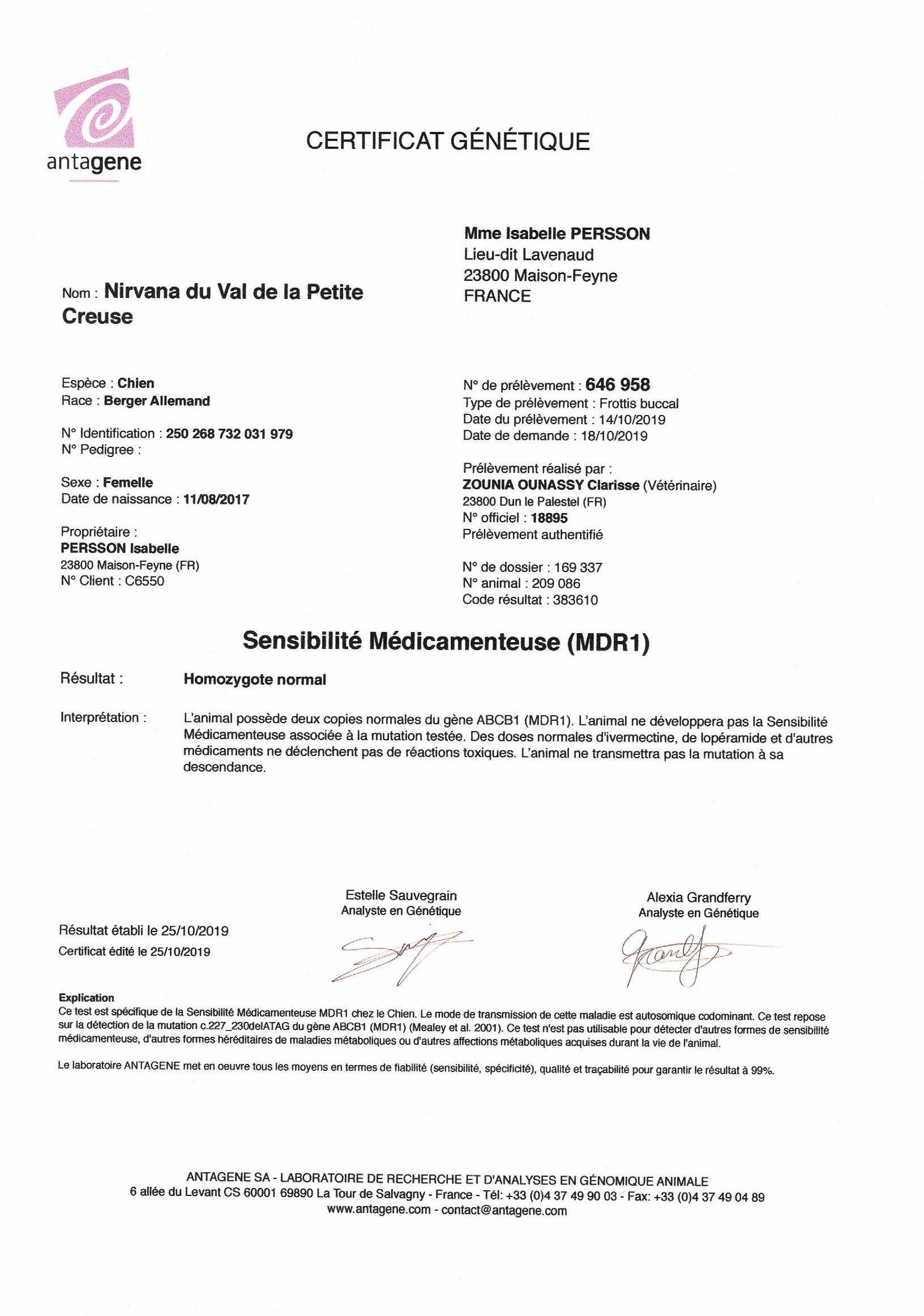 Le vétérinaire attitré de l’élevage et de la pension est le Docteur Clarisse Zounia-Ounassy, N° d’ordre 18895, 23800 Dun le Palestel Tél. 05 55 89 00 14